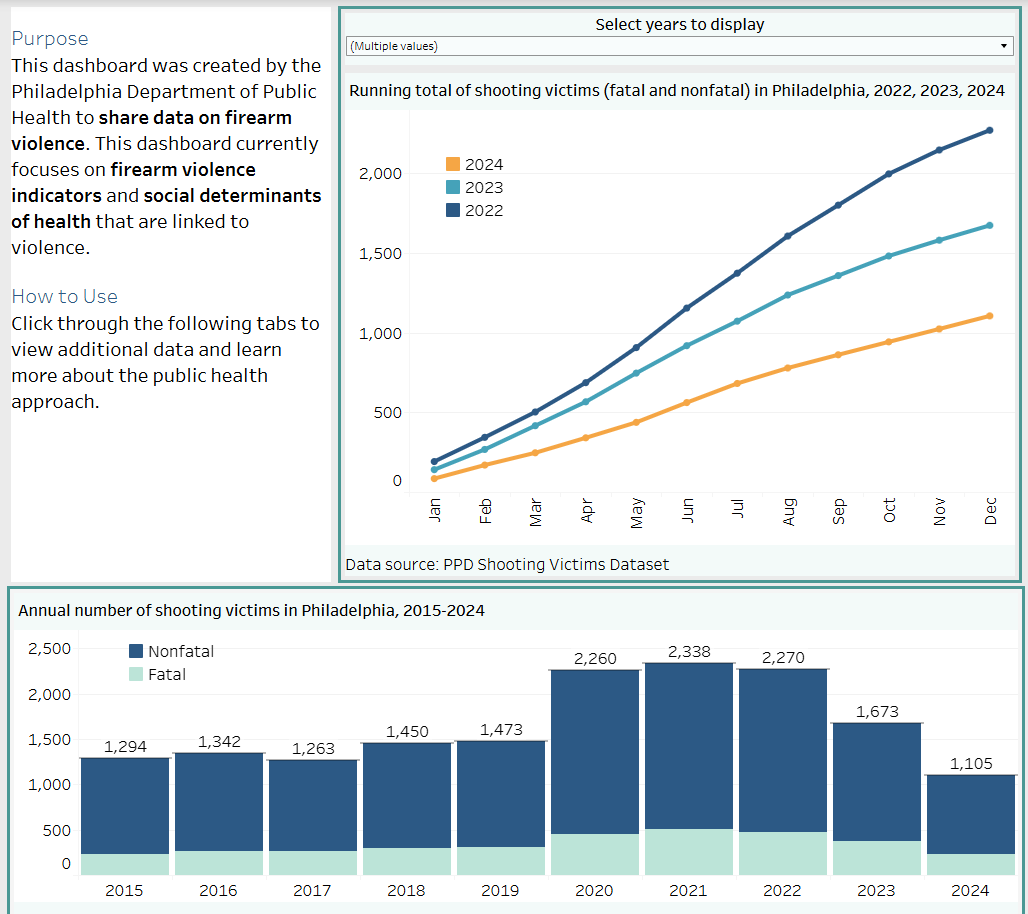 The Philadelphia Department of Public Health provides the Injury Prevention Dashboard to make public health data available and useful to a variety of stakeholders. The dashboard allows users to view, filter, and interact with relevant data, and demonstrates the significant decreases in shooting victims in Philadelphia over the past three years.
